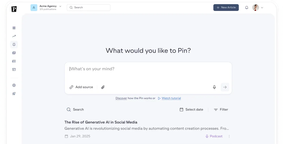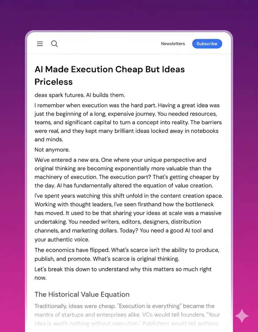 Absolutely! Our "Pin Your Thoughts" feature lets you drop any URL (YouTube videos, articles, podcasts, social posts) and instantly transform it into original content in your voice. It's not just summarization - it's adding your unique perspective and analysis to create something entirely new.